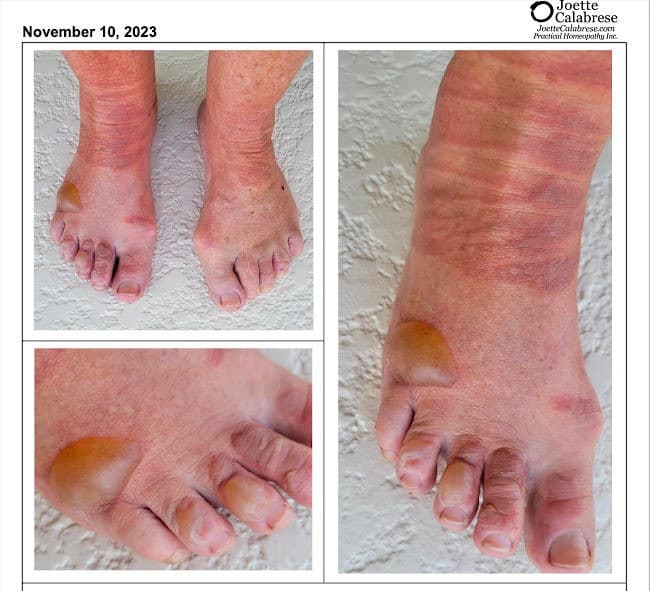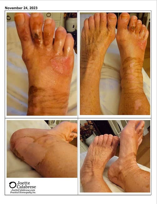 “December 4, 2023: After my setback on November 24 and about a week of higher potencies and elevation of legs, everything is almost completely healed!!! I continued with aloe plant and Calendula MT and soap.