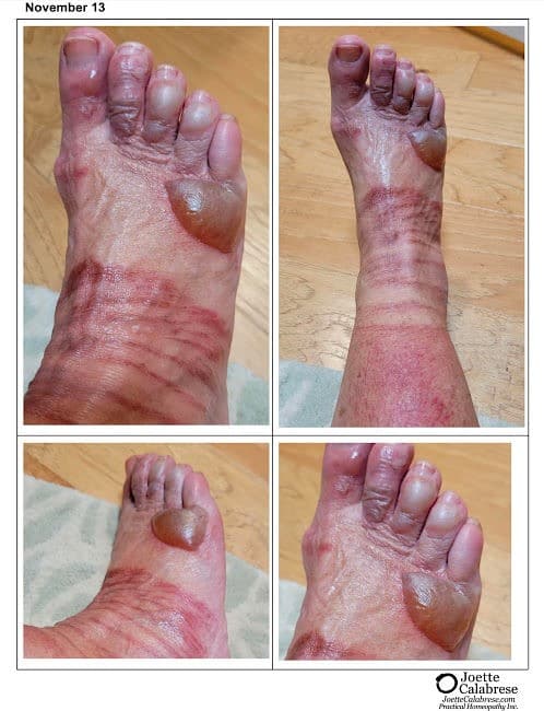“For the next several days, I went back to bed with leg elevated and increased potency of Cantharis back to 1M, Hypericum 1M, and added Hepar sulphuris calcareum 200, back to 4-6 times a day.