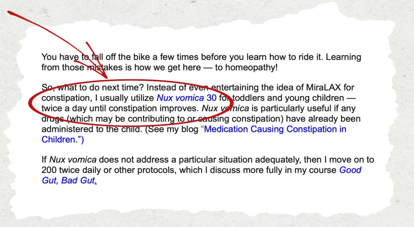 Consider my blog posts to be your first stop — your “Remedy Reference Guide.” Going back to our example, let’s search for “constipation” on my website. I’ve discussed the topic several times, so there are several blog posts and podcasts for you to choose from. But let’s look at one entry from the article The MiraLAX Blues.