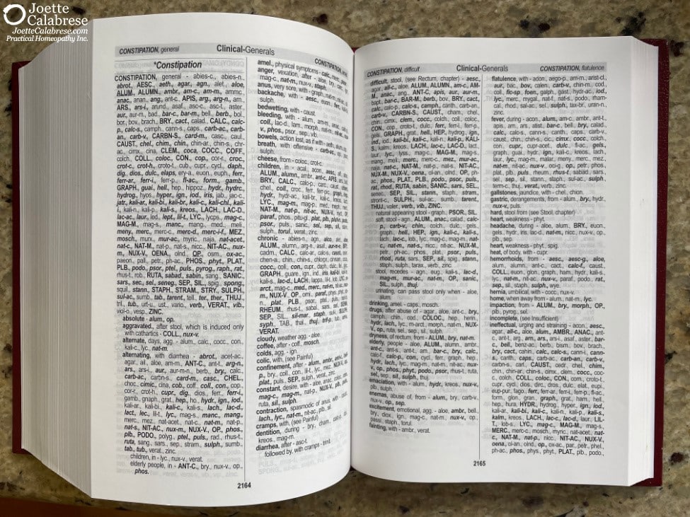 So, now, instead of considering the 200+ potential medicines listed for constipation, I simply teach, “For constipation, consider Nux vomica 30 twice daily, until the condition is resolved. To address hard, reluctant stools, consider Lycopodium 200 mixed with Plumbum metallicum 200, twice daily until stools return to normal.”
