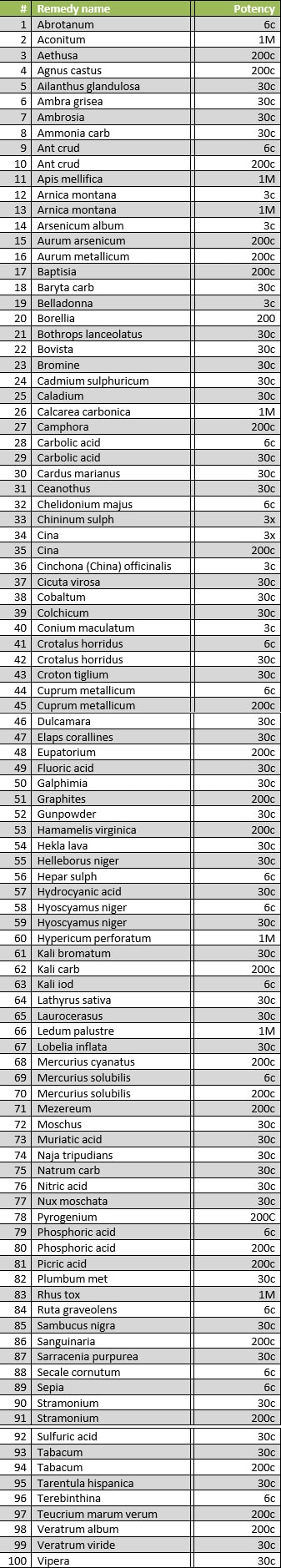The Top 100 and 200C homeopathy kits are no longer offered through my office, as we are unable to resupply our inventory from the manufacturer.